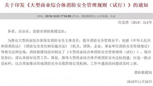 12月3日,应急管理部消防救援局印发《大型商业综合体消防安全管理规则(试行)》的通知。第十二条明确: