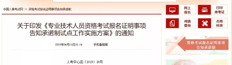 《专业技术人员资格考试报名证明事项告知承诺制试点工作实施方案》,明确2019各项考试报名细则。