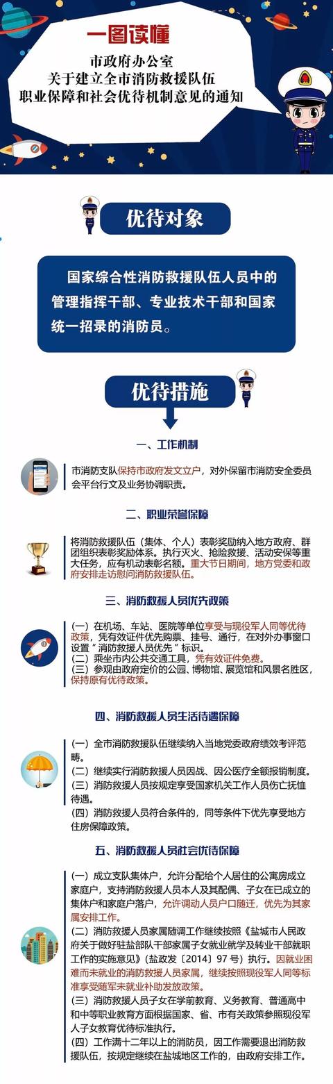 6月23日,盐城市人民政府办公室印发了《关于建立全市消防救援队伍职业保障和社会优待机制意见》的通知。从工作机制、职业荣誉保障、消防救援人员优先政策、消防救援人员生活待遇保障、消防救援人员社会优待保障等5个方面给予了明确规定。