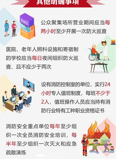 13、再次强调巡查、培训、演练的频率。公众聚集场所营业期间应当每两小时至少开展一次防火巡查;医院、老年人照料设施和寄宿制的学校应当每日夜间组织防火巡查,且不应少于两次。这个是考试的重点,必须牢记。