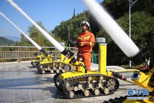 10月28日,在“远程供水系统铺设及收整操”项目竞赛中,消防员在操作消防机器人。 近日,福建省消防救援总队在三明市将乐县举行高层建筑跨区域灭火救援实战演练暨比武竞赛。此次演练共调集全省10个