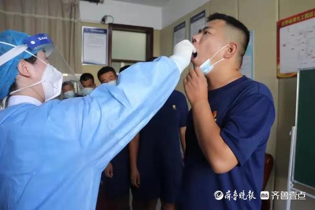 采样现场,为避免检测过程中造成人员聚集,提高检测速度,保证正常值班备勤,检测工作分批次轮流进行,全体指战员按照负责人安排的已定名单顺序,相互保持距离排队等待采样,此次核酸检测采用咽拭子的方式,采取指战员的咽后壁、腭弓附近的上皮细胞,进行核酸检测。