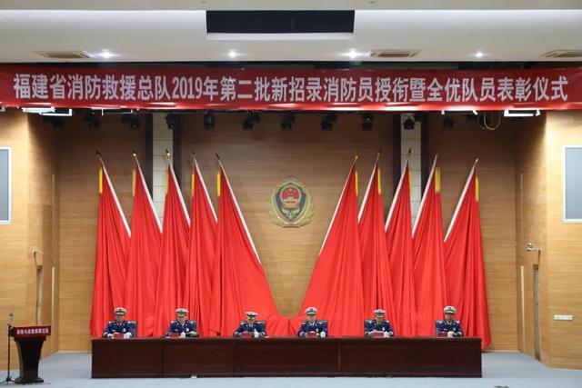 12月5日,福建省消防救援总队隆重举行2019年第二批新招录消防员授衔暨全优队员表彰仪式。总队长王文生、政委赖世雄以及总队在家党委成员出席授衔仪式,总队机关相关处室和各支队带队干部、新训支队全体指战员参加授衔仪式。