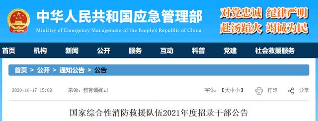为满足国家综合性消防救援队伍人才补充需要,按照公务员法和公务员录用有关规定,现将国家综合性消防救援队伍2021年度招录干部有关事项公告如下: