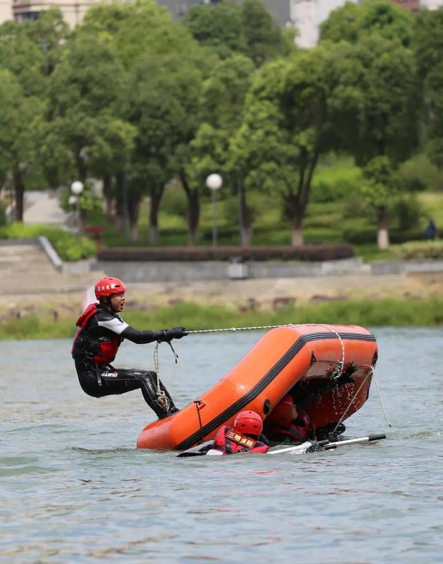7月7日消防队员在三明市将乐县金溪河进行“翻舟自救”项目的演练。