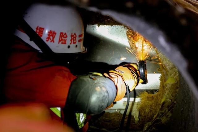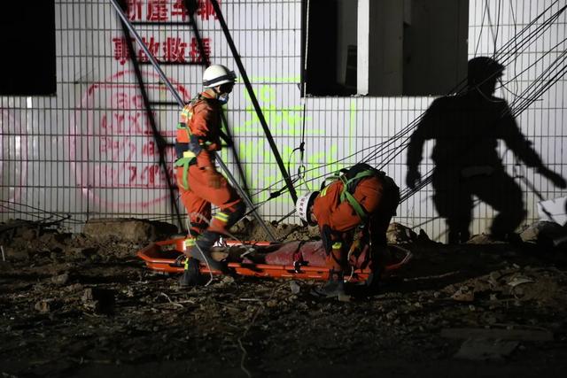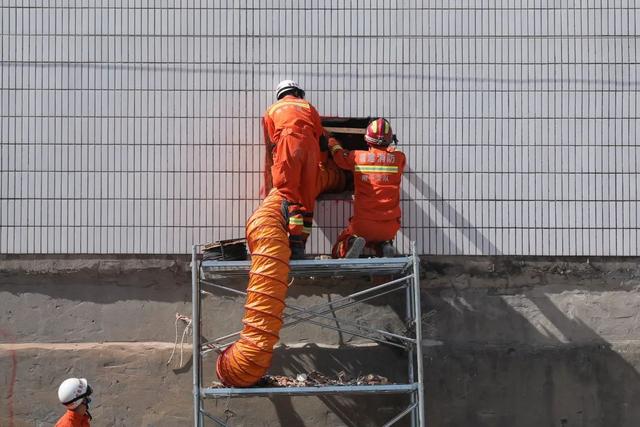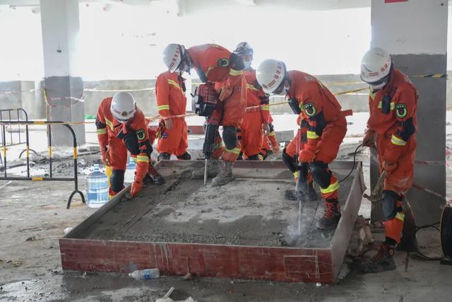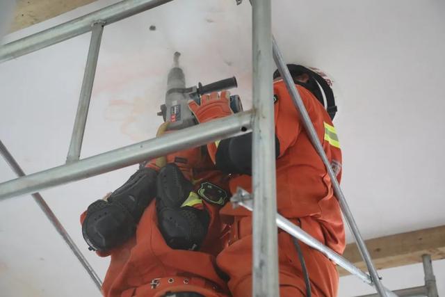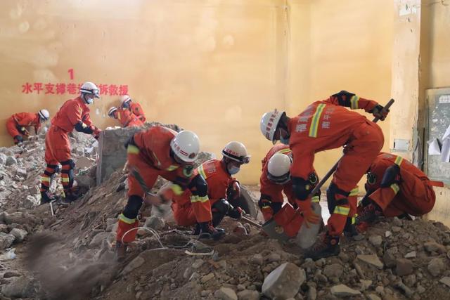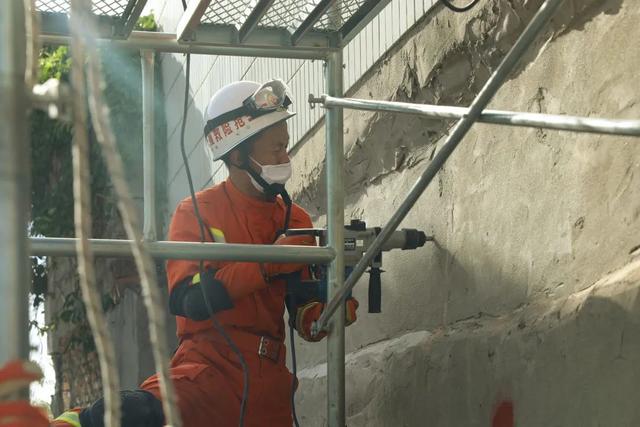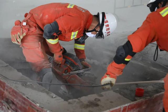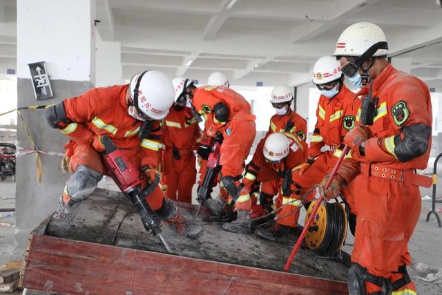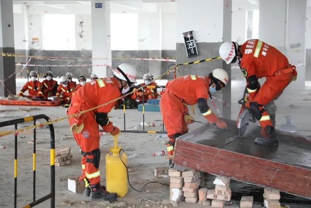 演练假设某工厂厂房发生倒塌,废墟内有1名被困人员。经侦查发现,正面救援通道被堵,救援人员从厂房背面破拆进入,救援过程中,对墙面开裂等不稳定墙体进行支撑保护,对巷道内废墟、建筑构件障碍物进行清理破拆。