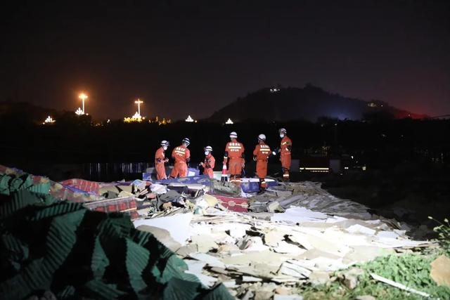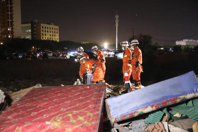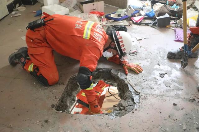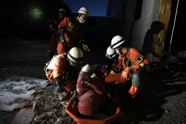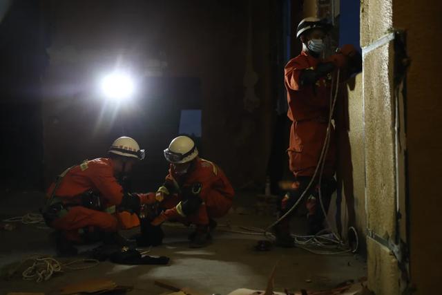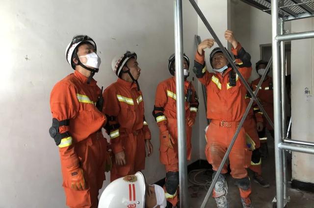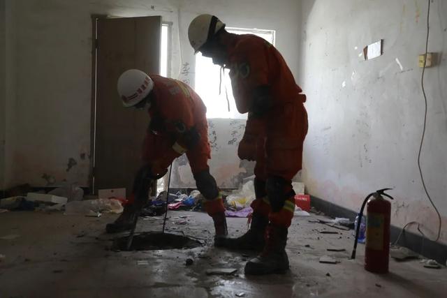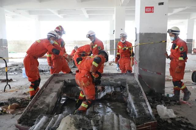 演练假设某工厂职工宿舍楼发生坍塌,三楼有1名人员被困,部分区域有着火。救援人员携带救援器材赶赴救援现场,对破拆楼板进行支撑,开展向上破拆,进入三楼开展灭火救人。