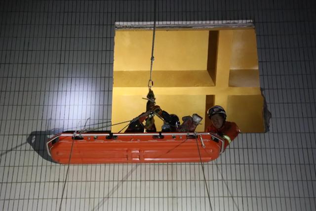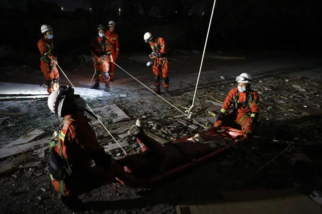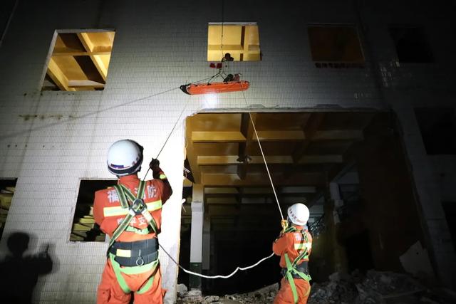 演练假设某工厂厂房发生坍塌,一名人员被困2楼。救援人对楼板进行破拆,开辟救援通道并将被困人员救出,通过厂房楼背面窗口,利用绳索将被困人员救至安全区域。