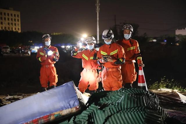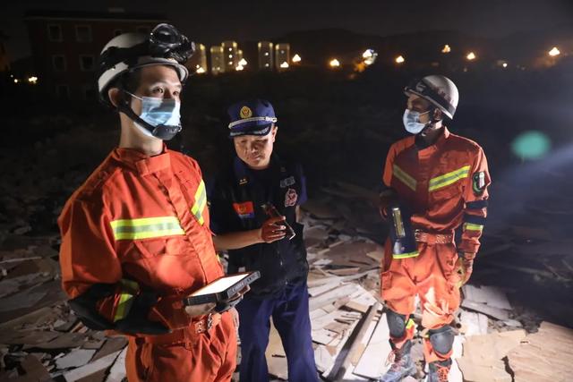演练假设某工厂员工宿舍楼发生整体垮塌,有人员被困。救援人员对坍塌建筑物进行安全评估,绘制作战图、确定搜救方案,并利用仪器精准搜索,对被困人员进行GPS定位,做好标识,实施救援。