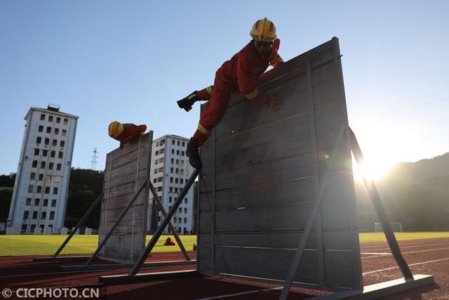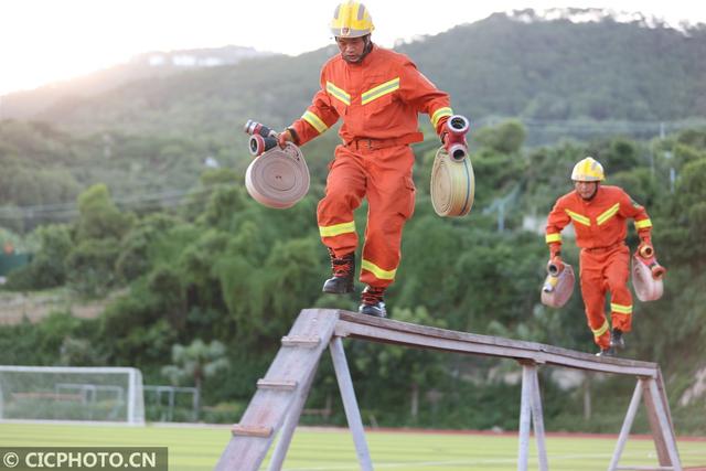 ↑2021年7月7日,在福建省厦门市海沧消防培训基地,消防员在进行“攻坚技巧”项目比拼。CICPHOTO/曾德猛 摄