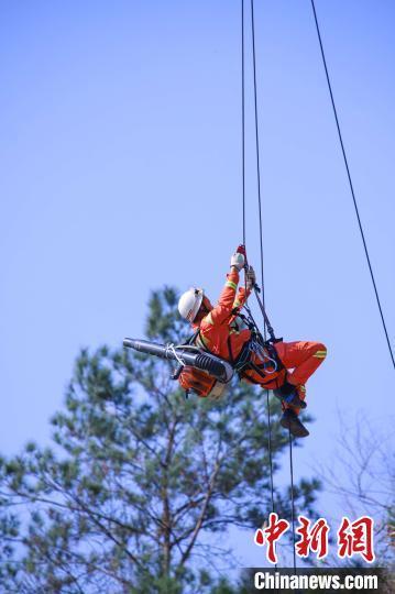 图为森林消防员进行高空绳索横渡训练 卢文锋 摄