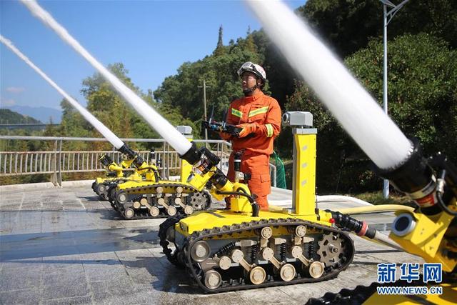 10月28日,在“远程供水系统铺设及收整操”项目竞赛中,消防员在操作消防机器人。 近日,福建省消防救援总队在三明市将乐县举行高层建筑跨区域灭火救援实战演练暨比武竞赛。此次演练共调集全省10个消防救援支队的3支重型、7支轻型救援专业队参加,开展远程供水系统铺设及收整操、高层供水打靶操、密闭空间人员搜救操、作战训练安全知识竞赛等。 新华社发(周杨东 摄)