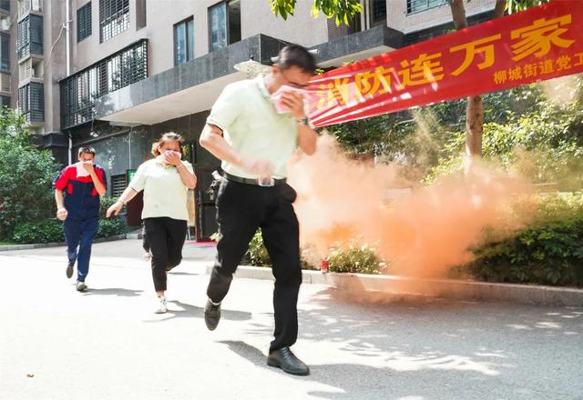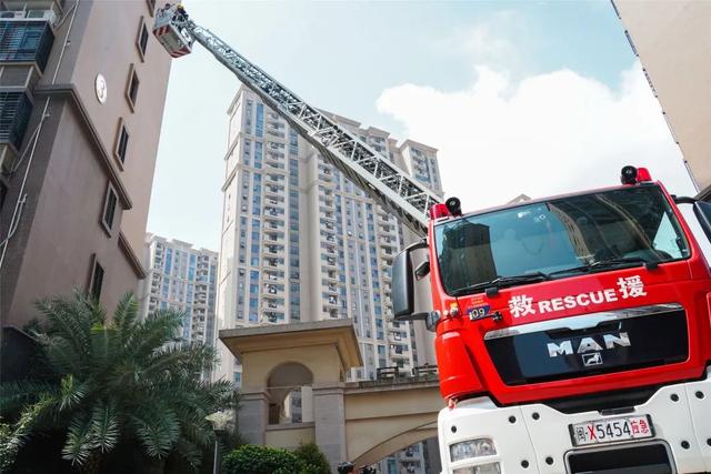 演练假设小区六楼起火,两名人员被困。听到警报声,小区物业立即组织居民快速疏散。南安市消防救援大队接警到场后,立即开展救援行动,将“被困人员”通过担架迅速转移到地面安全区域。