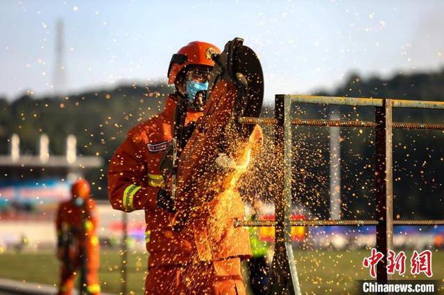 比武队员使用无齿锯切割钢筋。 朱源 摄