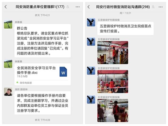 根据上级指示要求,大队在减少外出监督执法活动的情况下,灵活服务指导,采取多种监管方式,搭建微信工作群,采用不定时电话、视频等形式,随时检查重点单位、定点医疗机构和集中隔离点的消防安全制度落实情况、重点岗位人员在岗情况、疏散通道畅通情况,落实“线上”防火巡查,有效提升各单位在疫情防控期间的消防安全意识和火灾防控能力;充分发挥辖区“消防安全重点单位微信群”、“乡镇街道消防工作群”、“同安区微型消防站工作群”作用,每天定时发送消防安全管理提示信息,进一步夯实社会面火灾防控基础。