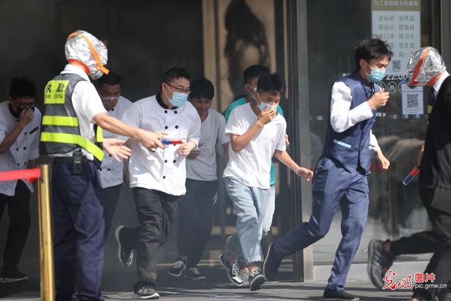2021年6月16日,在福建厦门一场大型商业综合体灭火救援演练中,商场员工有序疏散逃生。