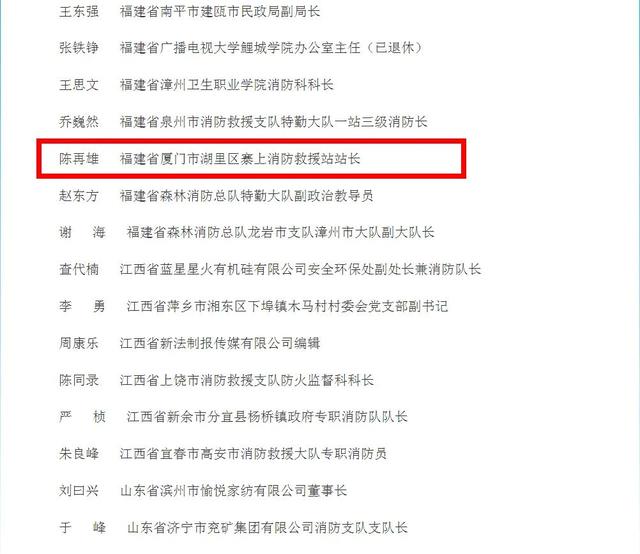 近日,应急管理部下发《关于表彰第五届全国119消防先进集体和先进个人的决定》,厦门市消防救援支队湖里区寨上消防救援站站长陈再雄荣获先进个人称号。