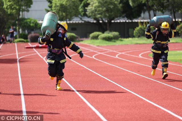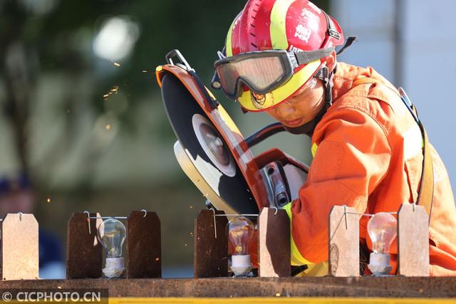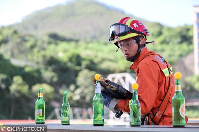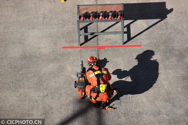 ↑2021年7月7日,在福建省厦门市海沧消防培训基地,消防员在进行“攻坚技巧”项目比拼。CICPHOTO/曾德猛 摄