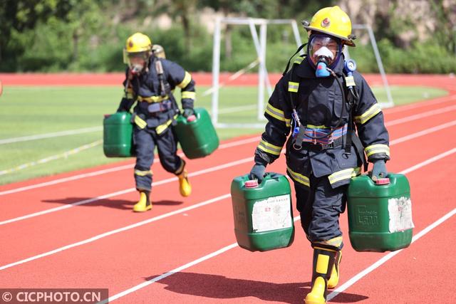 ↑2021年7月7日,在福建省厦门市海沧消防培训基地,消防员在进行“百米障碍救助”项目比拼。CICPHOTO/曾德猛 摄