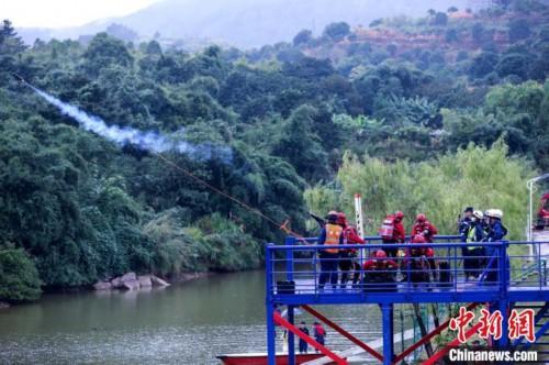 本文的标题是《首届森林消防特种救援技能比武在福州上演》来源于网络由作者陈耀采编而成,本文关键词为:福州,特种,主要讲述了比武队员使用抛投器送绳至对岸。卢文锋摄比武队...